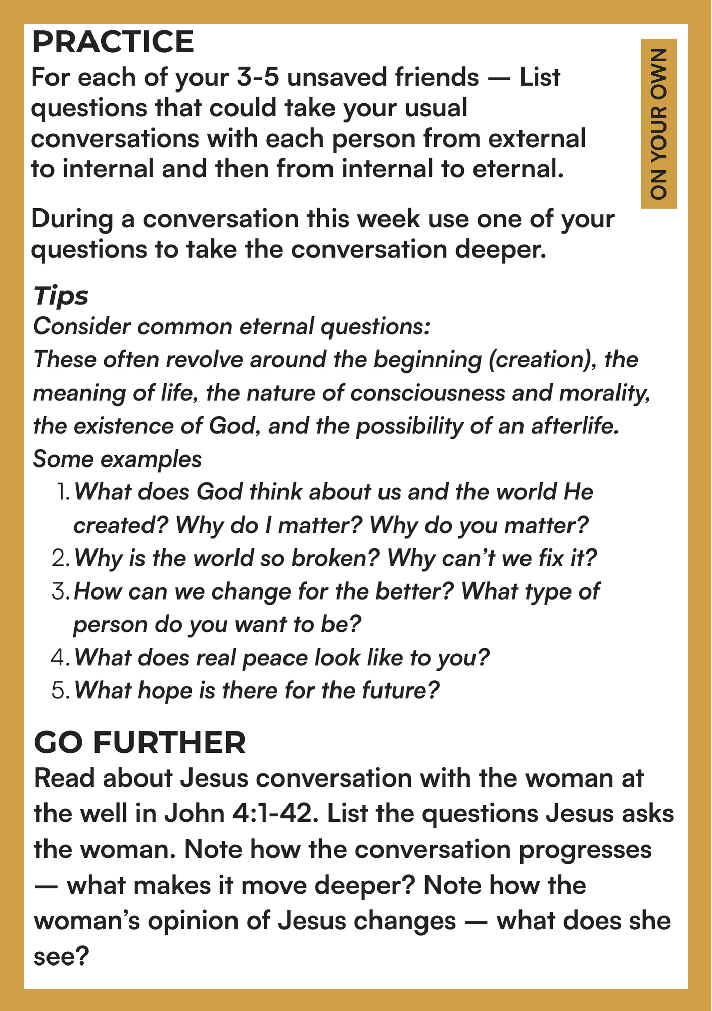 - Share about a time a conversation with a non-Christian friend has entered the Eternal level. How and why did the conversation get there?